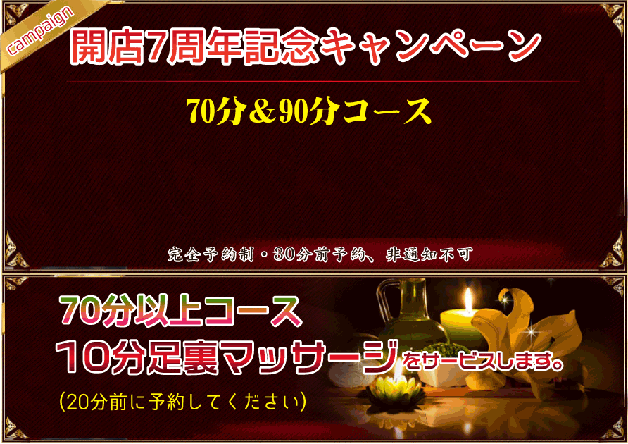 毎日頑張っている紳士の皆様、日頃の疲れになっている身体と心を、 幸福なる雰囲気包まれた癒しの場所、落ちついた部屋の個室で可愛いセラピスト達がお待ちしております。 当店のセラピストは若く容姿端麗にこだわりました、まるで蜜のように甘く幸せな空間でゆったりとした時間をお過ごし下さい。 |